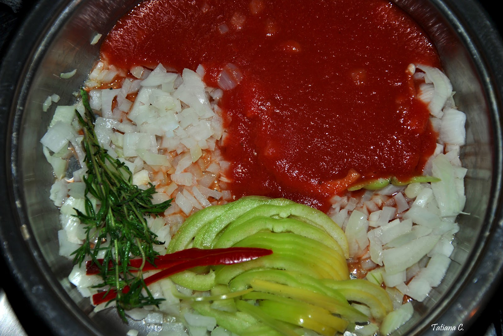 Am luat 2 cepe le-am tocat mărunt și le-am călit în unt topit. Am adăugat pieptul de pui feliat cubulețe și 3-4 fire de rozmarin, sare și piper. Așa au fost lăsate la foc mic 30min. Pastele au fost fierte 10min în apă cu sare. Am luat a 3-a ceapa am tocat-o mărunt și am calit-o la foc mic, apoi am adăugat sosul de roșii, ardeii grași feliați fîșii și 1/3 din ardeiul iute + 2-3 fire de rozmarin – 15min la foc mediu. Apoi am adăugat carnea în sos și am mai lasat să fiarbă 5min. Asta a fost tot. Foarte important, nimic nu trebuie ”prăjit”, se gătește la foc mic și mediu – în armonie toate ingredientele. Ingredientul principal – puțin suflețel 🙂
