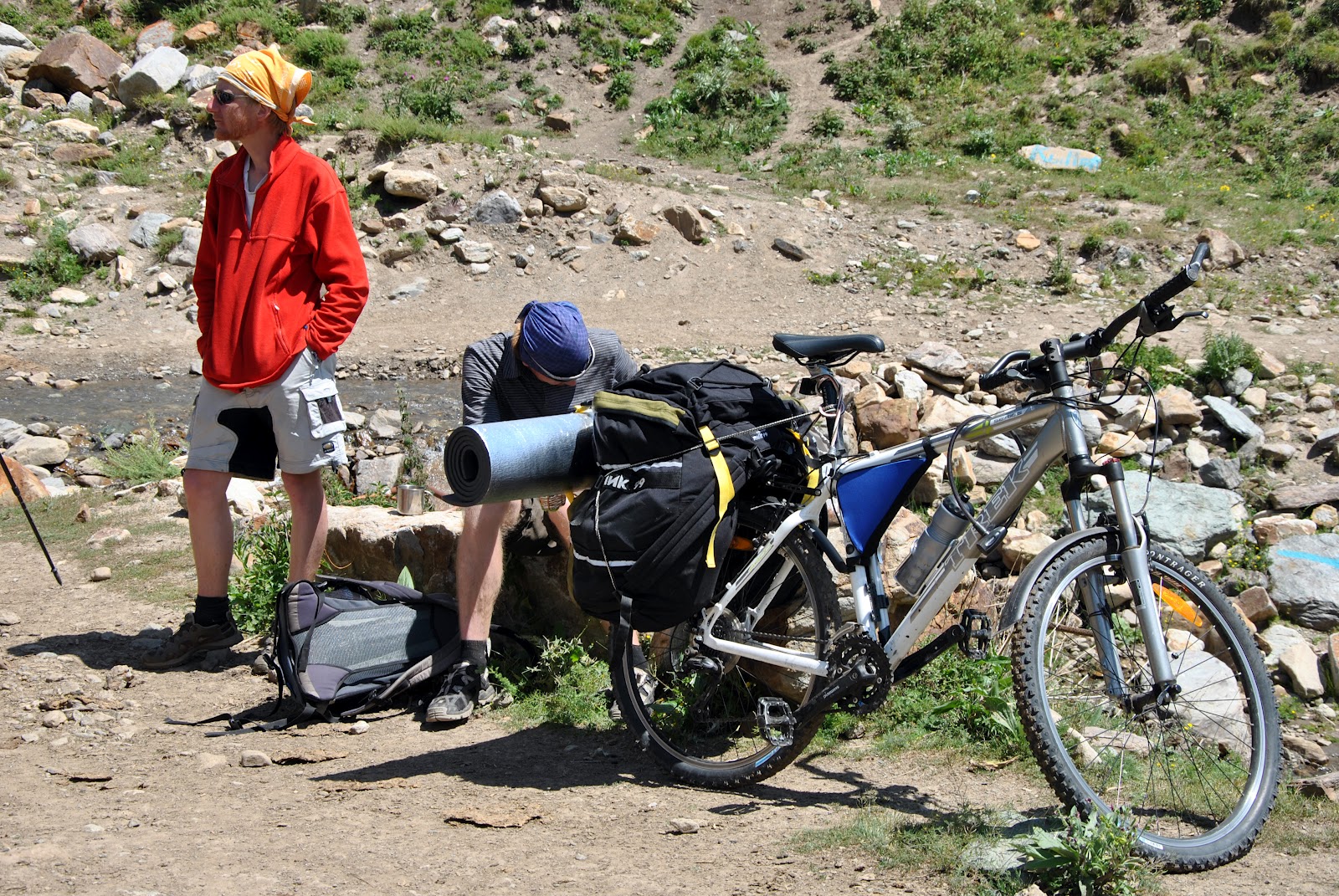 Continuăm pe traseu până revenim la punctul din care am pornit acum 3 zile, Verhnyi Baksan. Pe drum am întilnit un grup de cicliști care faceau un popas și ne-au servit cu alune. Ce mult mi-aș fi dorit o plimbare cu bicicleta prin asemenea locuri – dar asta pe viitor. Și la mai puțin de 2 km înainte de a ajunge la destinație, vedeam muntele pe care am urcat cu 3 zile în urmă și serpantinele…
