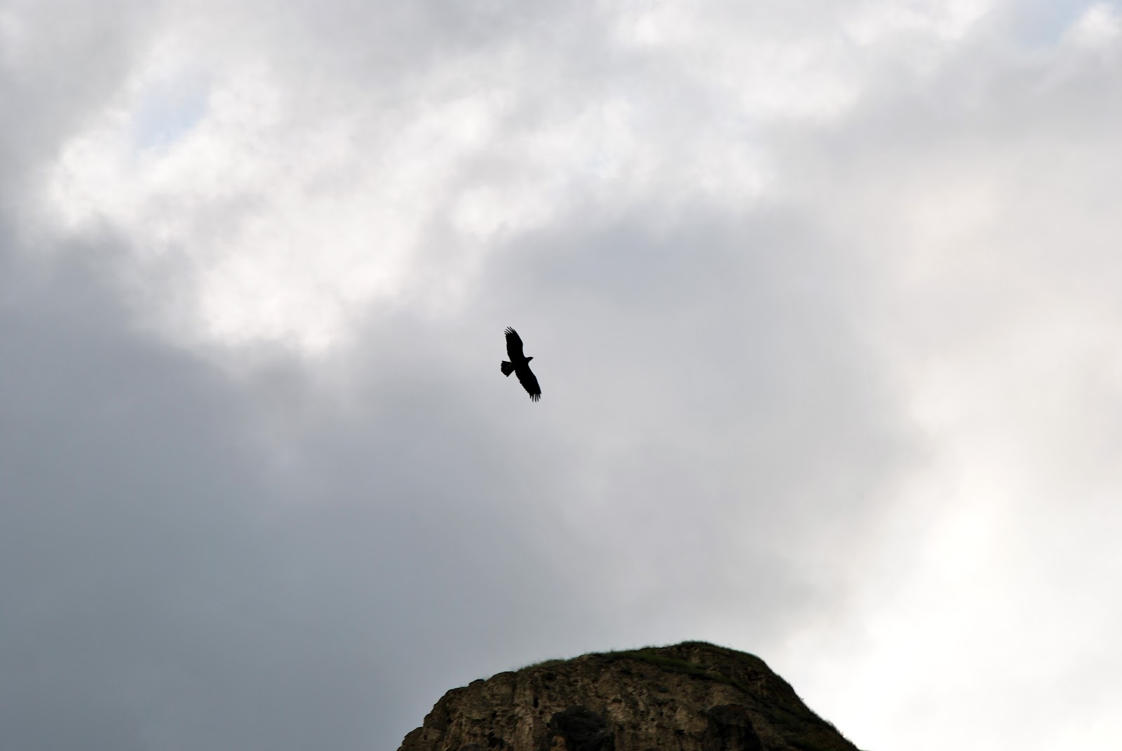 Eh, şi de acum: adio civilizaţie, din acest moment contăm doar pe forţele proprii şi continuăm călătoria spre adâncul munţilor. Am tot mers de-a lungul râului, în faţă se înălţau falnice vârfuri şi întregi lanţuri muntoase. O vreme, companie ne-a ţinut un vulture, care zbura liniştit deasupra stâncilor. Îşi întindea hotărât aripile şi se lăsa dus de vânt, am scos aparatul foto pentru a-i face câteva poze, dar s-a retras de partea cealaltă a stâncii, îl strigam să revină (am stîrnit veselie în grup), dar vulturul nu m-a dezamăgit şi cîteva clipe mai târziu aud – “Uite-l!”