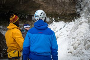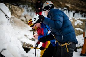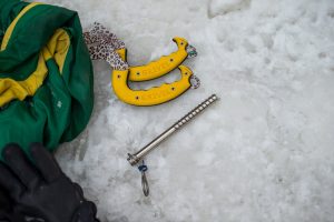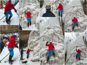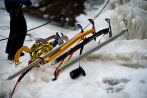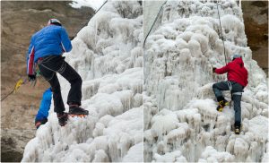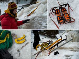 ECHIPAMENT Cele mai comune elemente ale echipamentului pentru cățărările pe gheață sunt șuruburile de gheață, pioleții, casca de protecție, bocancii tehnici și colțarii tehnici – dispozitive metalice prevăzute cu o serie de colți, care se prind de talpa încălțămintei ca să nu alunece pe gheață, încălțămintea trebuie să fie bine izolată termic, mai multe perechi de manuși, iar pentru cațărările pe cascade de apă este obligatoriu și un costum Gore-Tex pentru a evita experiența unui posibil duș la temperaturi de 0 grade. Deseori, cățărătorii își aleg echipamentul în funcție de înclinarea pantei și consistența gheții.