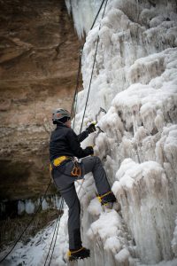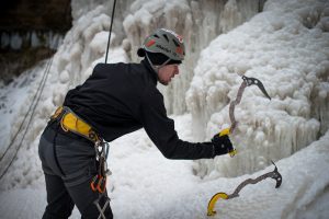 ECHIPAMENT Cele mai comune elemente ale echipamentului pentru cățărările pe gheață sunt șuruburile de gheață, pioleții, casca de protecție, bocancii tehnici și colțarii tehnici – dispozitive metalice prevăzute cu o serie de colți, care se prind de talpa încălțămintei ca să nu alunece pe gheață, încălțămintea trebuie să fie bine izolată termic, mai multe perechi de manuși, iar pentru cațărările pe cascade de apă este obligatoriu și un costum Gore-Tex pentru a evita experiența unui posibil duș la temperaturi de 0 grade. Deseori, cățărătorii își aleg echipamentul în funcție de înclinarea pantei și consistența gheții.