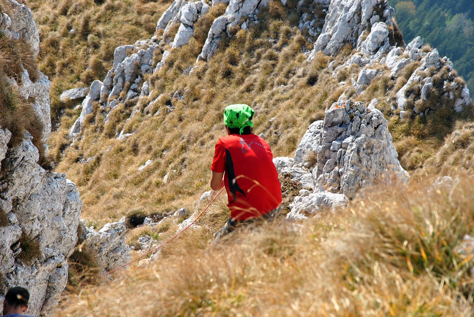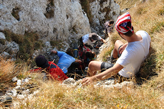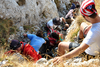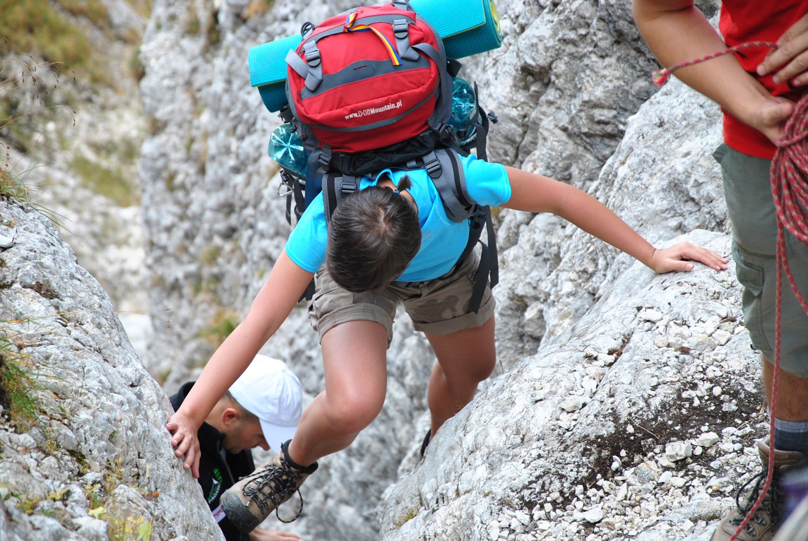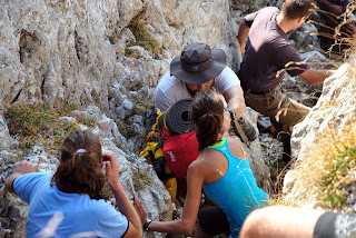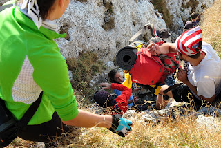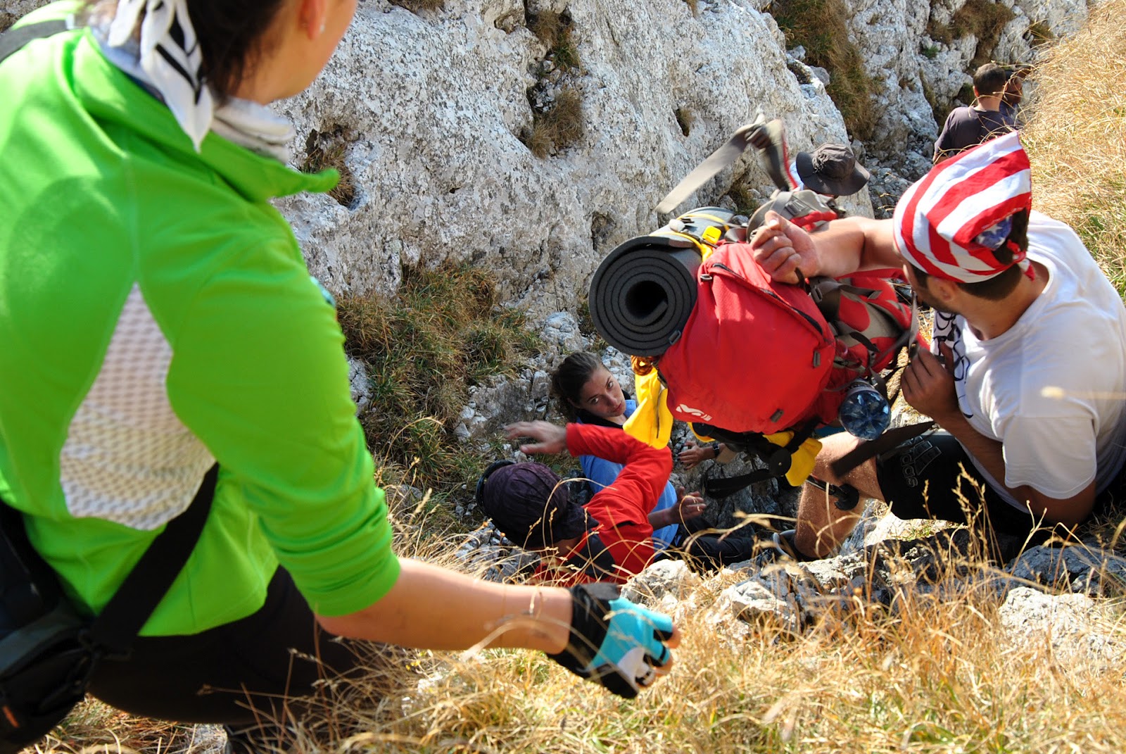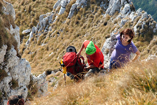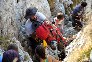Pe o porțiune din traseu am urcat fără rucsaci, aceștia din urmă fiind ”transportați” mai întâi pe o cordelină și apoi transmiși din mână în mână până sus))